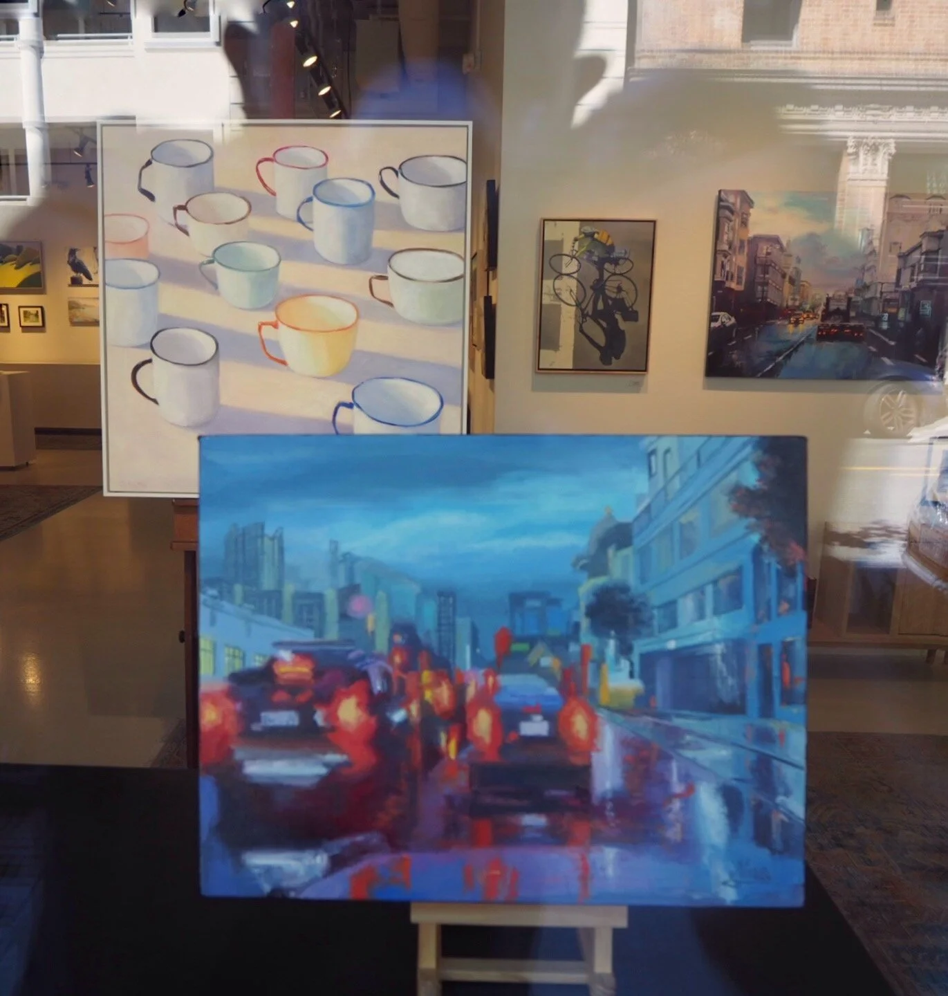 Regatta by the Sea by Carla Roth seen through the window. On the easel is Succulent by Bruce Katz